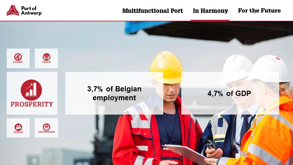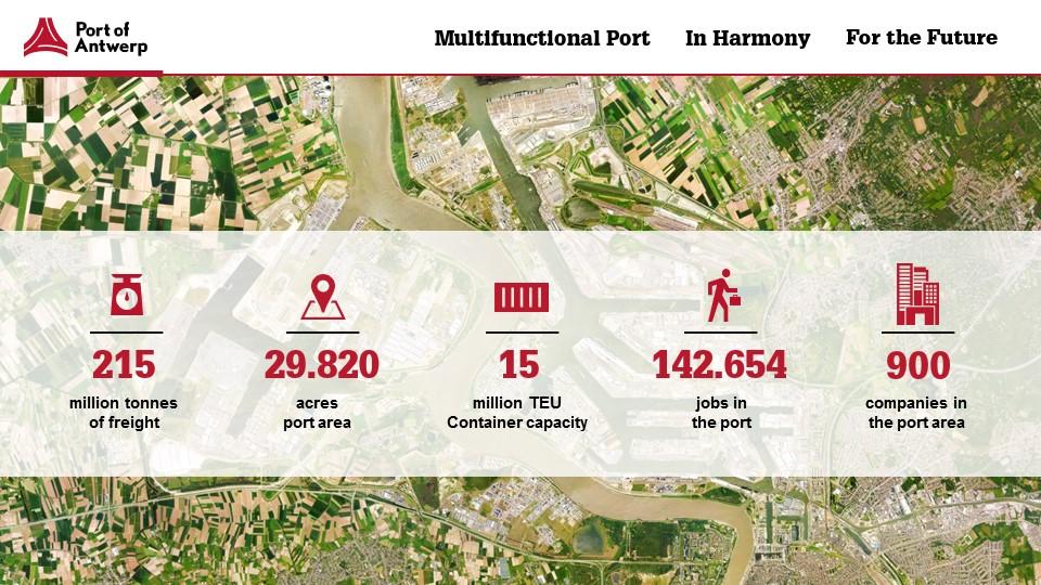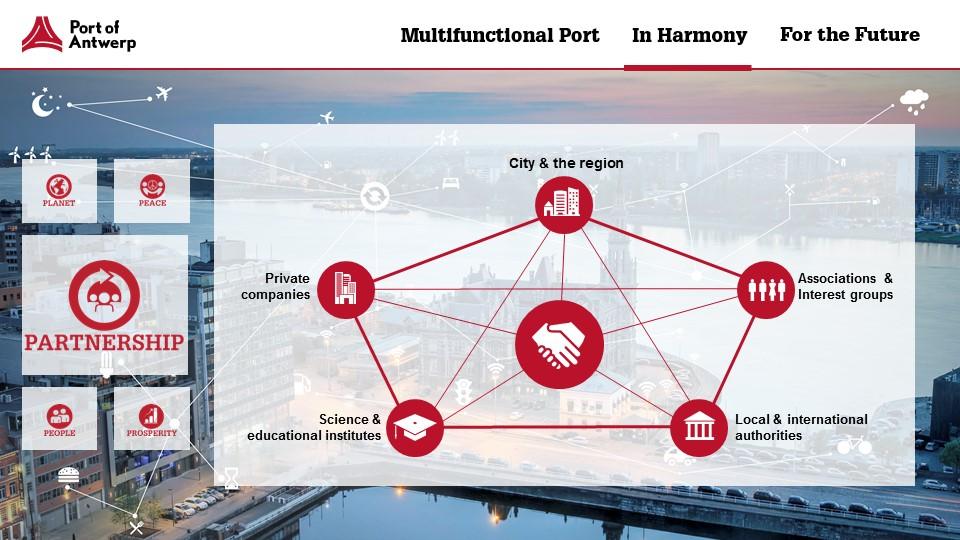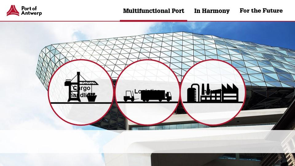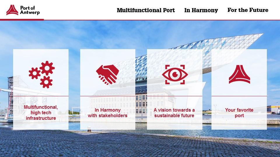 Het verhaal van het Havenbedrijf Antwerpen is zo breed als het aantal vierkante meters van de haven zelf. Om de boodschap zo duidelijk mogelijk te brengen werd een eenvoudige basisstructuur opgezet voor de presentatie. Deze is op elke slide zichtbaar zodat ook vanop elke slide naar een ander basisonderdeel kan worden doorgeklikt. Deze opbouw biedt tevens de mogelijkheid om achteraf nog onderdelen aan de presentatie toe te voegen.