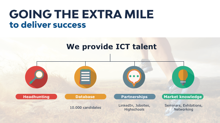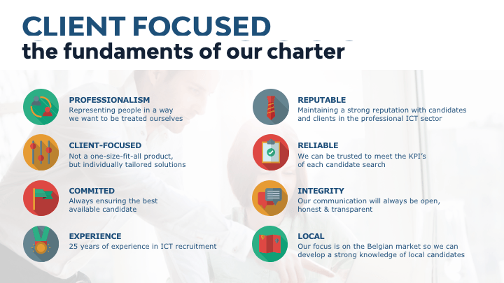 Naast een sterke en professionele verkooppresentatie voor de persoonlijke gesprekken zocht Amandis een document om achteraf te kunnen nasturen of om als prospectie vooraf aan potentiële klanten door te sturen. Op basis van de overtuigende presentatie werd een PDF document gemaakt met dezelfde grafische elementen als in de presentatie maar met slechts een deel van de inhoud.
