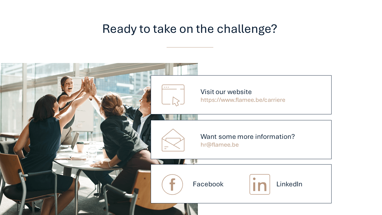 "Hartelijk bedankt voor de mooie presentatie die je voor Flamée & Partners hebt gemaakt. Op de meet & greet sprongen we er echt uit tussen de grote concullega's. De invalshoek die je bedacht was er 'boenk' op."